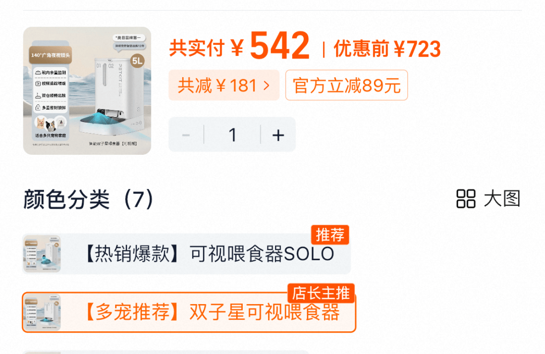 在天猫“小佩宠物用品旗舰店”中,该款“双子星可视喂食器”售价542元。
