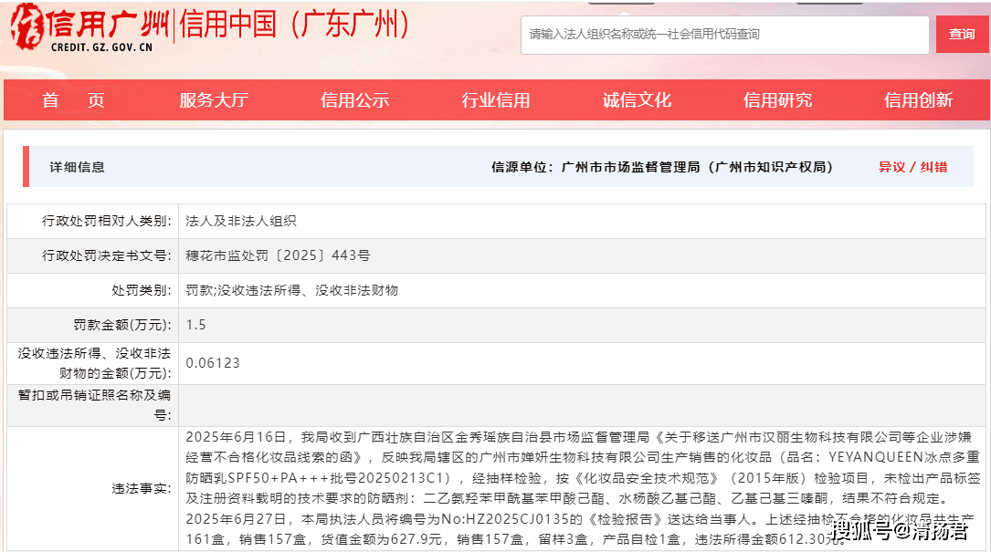 近日,广西金秀瑶族自治县市场监督管理局的一纸处罚决定书,将广州市婵妍生物科技有限公司(以下简称“婵妍生物”)推上风口浪尖。其生产的“YEYANQUEEN冰点多重防晒乳SPF50+PA+++”因成分造假被罚没1.56万元,这起看似普通的行政处罚,再现了化妆品行业长期存在的“配方表与实际成分两张皮”的乱象。