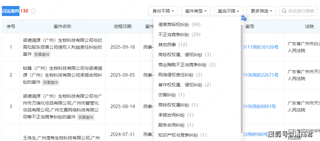 企查查司法案件数据显示,诺德溯源目前涉及的法律案件共计130件。其中,该公司作为原告的案件有113件,作为被告的案件有2件,其他案件15件。从案件类型来看,多数案件涉及商标侵权,另有一部分与不正当竞争相关,反映出诺德溯源在知识产权保护方面采取了较为积极的法律行动。