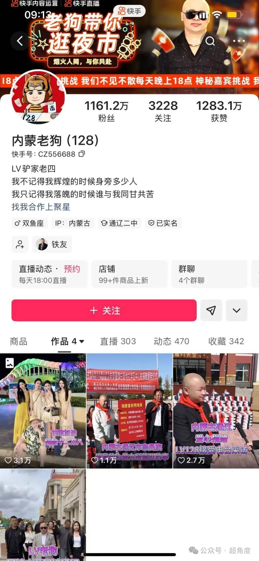 内蒙老狗快手账号1161万粉丝,目前仅4个作品,多是捐款、献爱心的视频。