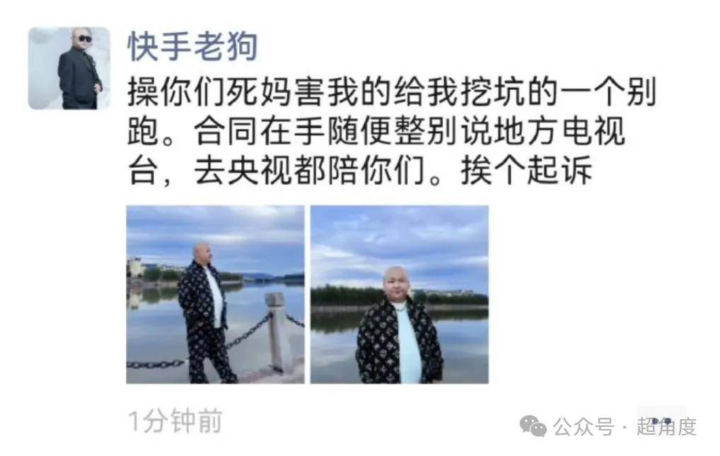 网友贴出疑似老狗的朋友圈:害我的给我挖坑的一个别跑,合同在手随便整,别说地方电视台,去央视都陪你们!挨个起诉!