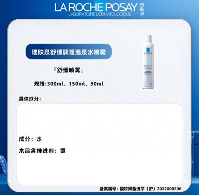 新京报贝壳财经记者在进口普通化妆品备案信息平台查询了解到,理肤泉舒缓调理温泉水喷雾的备案编号为国妆网备进字(沪)2022000596,备案日期为2022年4月11日,成分为“水”,具有舒缓的功效,且产品适用于敏感肌肤。