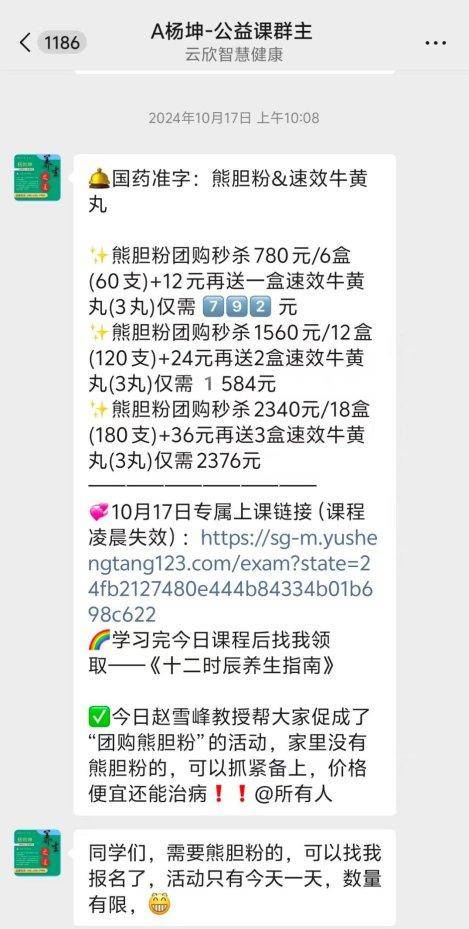 帮办记者卧底微信群发现,直播间所在的微信群里除了推广和销售杜先生购买的两款产品,还涉及博客健牌牦牛骨粉氨糖软骨素胶囊、熊胆粉、速效牛黄丸。按规定,氨糖属于保健品,不能宣传功效,而赵雪峰却说是老人必备,能防止骨质疏松和骨折等。熊胆粉、速效牛黄丸属于药品,从事药品销售活动必须具备药品经营许可证等相关资质,在符合规定的场所,如药店、医疗机构等进行销售。