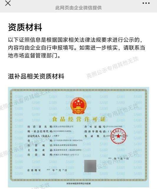 记者进一步查询发现,该直播微信公众号的注册企业沈阳云欣科技有限公司只有食品经营许可证,不具备销售药品的相关资质。