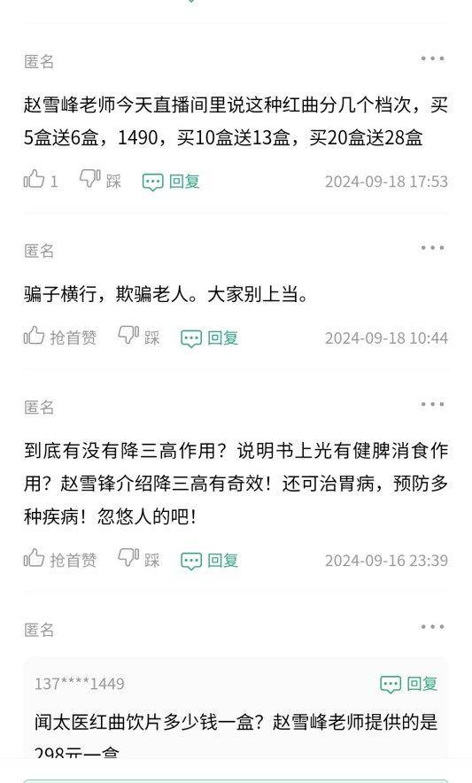 记者在兔灵医药网检索发现,早在2023年就有网友投诉:“赵雪峰把1500元的保健品卖到5000元,还说包治百病,这不是骗子是什么?”