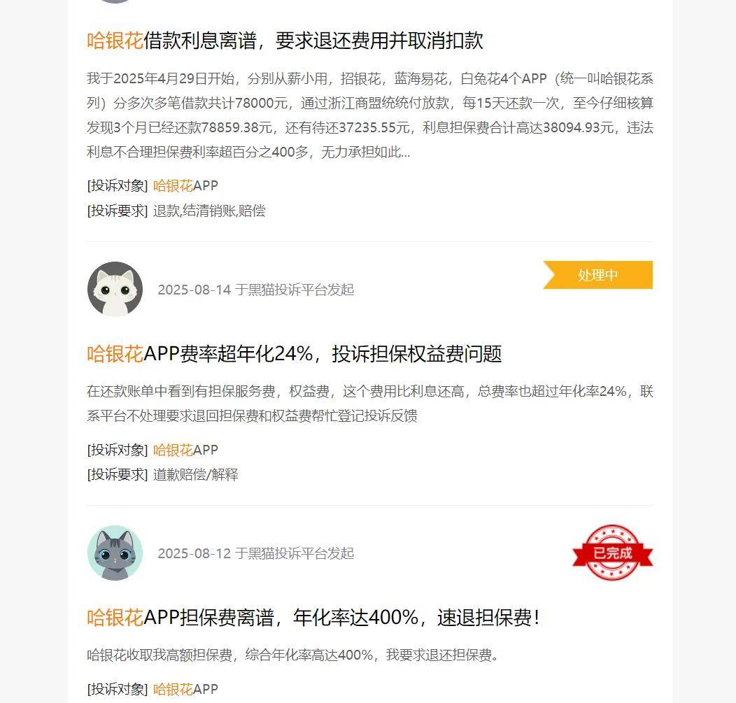 一位哈银花用户在黑猫投诉详细阐述了其在哈银花的9次借款经历:第一次为“2024年11月21日借款2000元,实际还款2639.6元,担保费600元”,该用户最后一次借款为“2025年7月23日借款4000元,实际还款5465.7元,担保费1400元,第一次还款日8月6日已完成,还款2732.85其中担保费700元第二次还款日8月20日。”