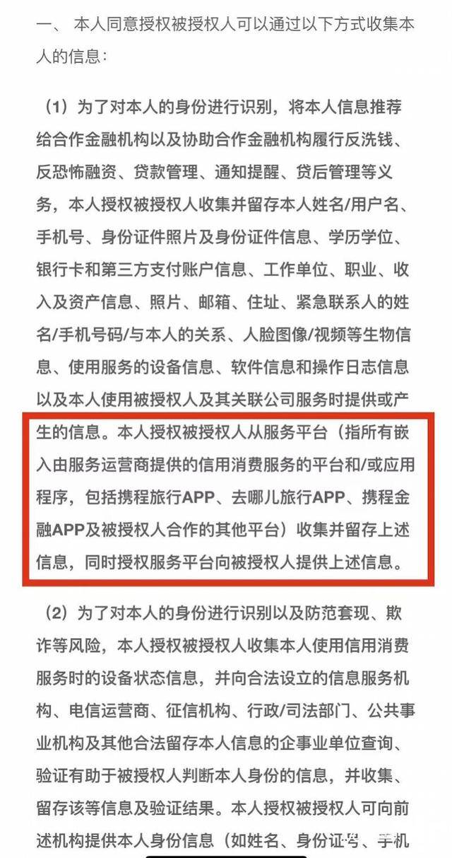 例如,“拿去花”《个人信息使用授权书》明确显示,“本人授权被授权人从服务平台(指所有嵌入由服务运营商提供的信用消费服务的平台和应用程序,包括携程旅行App、去哪儿旅行App、携程金融App及被授权人合作的其他平台)收集并留存上述信息,同时授权服务平台向被授权人提供上述信息”。