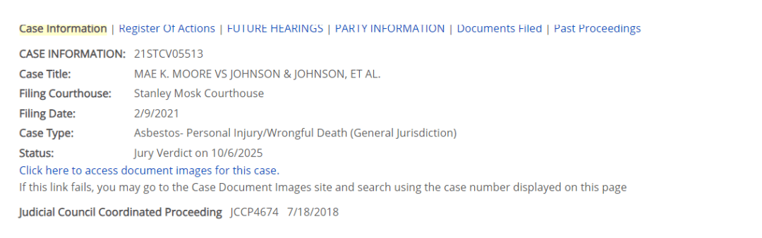 美国加利福尼亚州高等法院洛杉矶县分院官网显示,当地斯坦利莫斯克法院陪审团于10月6日裁决了一起强生公司的被诉案,该案于2021年2月9日立案,类别为强生产品被指含有石棉的“人身伤害/非正常死亡”。