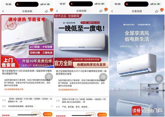 读特新闻记者从蔡先生提供的交易快照中发现,两家售卖“格力空调”的淘宝店铺,均在商品名称中明确写有“格力空调”。商品详情页的文字、图片介绍,与格力官方旗舰店同款空调的介绍一致。商品头图和介绍中也突出了“官方全新”“整机10年免费保修”“新一级能效”等卖点。
