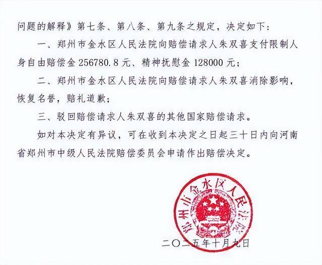 10月9日,郑州市金水区法院出具《国家赔偿决定书》,决定由该法院向朱双喜支付限制人身自由赔偿金约25.68万元、精神抚慰金12.8万元,共计38万余元。同时决定由金水区法院向朱双喜消除影响,恢复名誉,赔礼道歉,驳回他的其他诉求。