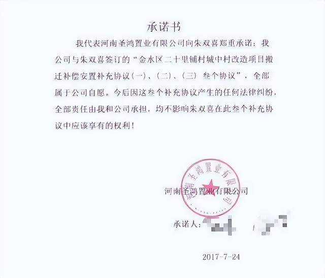 朱双喜出具的证据显示,同年7月24日,圣鸿公司给他出具的“承诺书”称,他们与朱双喜签订的3份补充协议全部属于公司自愿,今后因这3份补充协议产生的任何法律纠纷,“全部责任由我和公司承担,均不影响朱双喜在此3个补充协议中应该享有的权利。”