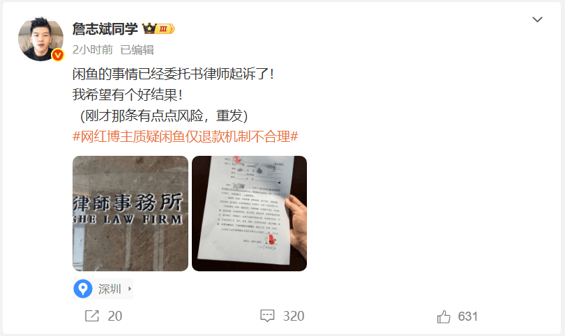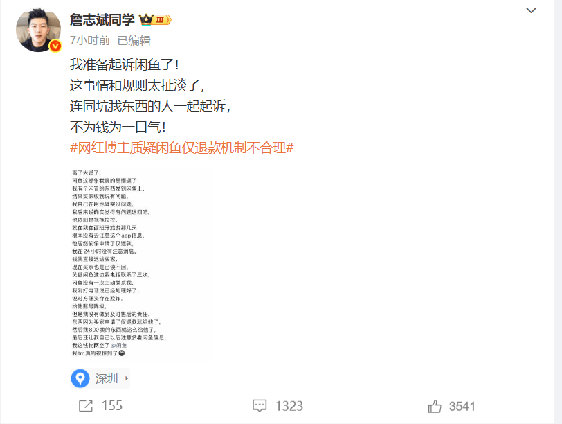 10月13日,拥有近500万粉丝的数码、汽车领域博主@詹志斌同学通过社交媒体发声,称因未及时处理平台消息,价值800元的闲置物品被闲鱼平台自动同意“仅退款”,最终陷入钱物两空的境地,已决定起诉闲鱼平台及涉事买家。