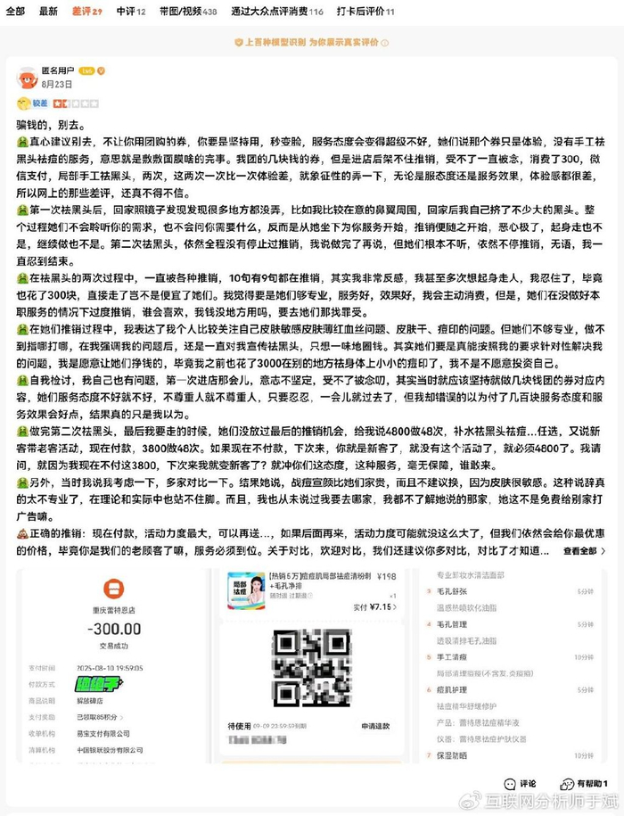 据消费者描述,她团购了几块钱的券,但是进店后因架不住推销,支付了300元做局部手工祛黑头两次。工作人员仅仅是象征性操作一下,无论服务态度还是服务效果,体验感都很差,所以网上的那些差评,该消费者不得不信。
