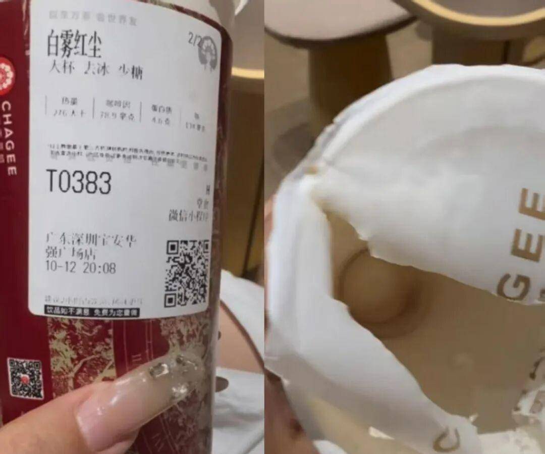 据经视直播报道,近日,有网友在社交平台发文爆料,称10月12日在霸王茶姬深圳宝安华强广场店购买的一杯奶茶中,快喝完时发现杯内混入一个类似瓶盖的异物。