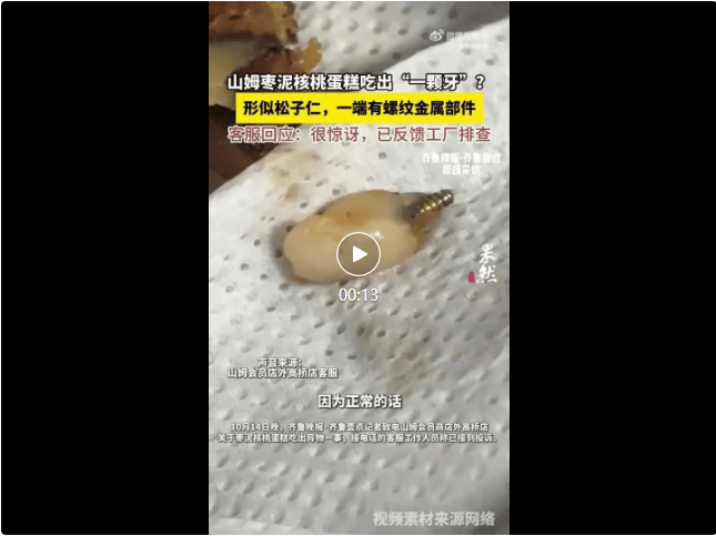 10月14日,有上海网友发布视频称,自己在上海的山姆会员商店外高桥店购买的枣泥核桃蛋糕中,吃出了一颗牙齿。视频画面显示,这颗牙齿状异物形似松子仁,一端有带螺纹的金属状部件。