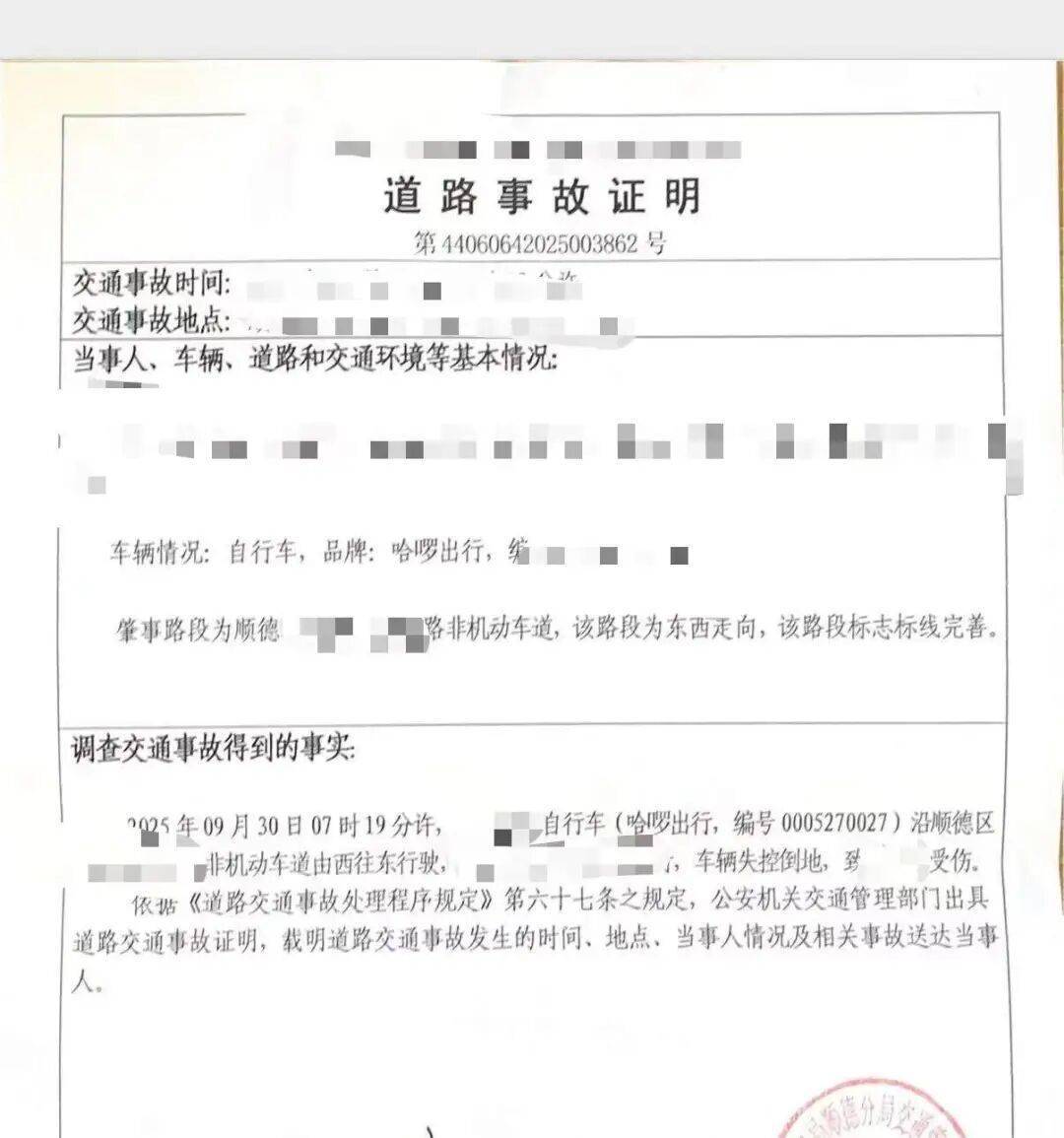 9月30日7时10分左右,在佛山市顺德区的一条路上,张女士像往常一样扫码骑上一辆蓝色哈啰共享单车准备上班。骑行约两公里后,意外突然发生。