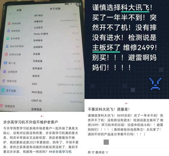 还有消费者发帖吐槽,“买的小度学习机,用不到半年就出现闪屏故障,寄去维修后,拿回来不到半年又出现同样的问题”“购买的科大讯飞学习机使用不到二十天频繁出现死机的情况”“听力熊刚买两周就死机无法进入系统”……因学习硬件产品质量问题而被消费者吐槽、投诉的案例并不在少数。