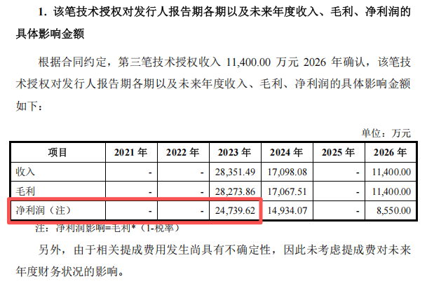新芯股份的盈利质量堪忧,其利润高度依赖关联方“公司二”的技术授权收入。据问询函回复材料披露,2023年,新芯股份从该技术授权业务中确认收入2.84亿元,对应产生的净利润高达2.47亿元。而新芯股份2023年全年的归母净利润为3.94亿元。这意味着,仅此一项关联交易就贡献了公司当年超过六成(62.7%)的净利润。然而,招股书明确提示,若不考虑未确定的提成费,2025年该交易对净利润贡献将降为零。