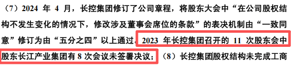 1、股东决策分歧:2023年长控集团(控股股东)的11次股东会中,股东长江产业集团有8次未签署决议,反映内部协调机制失效。