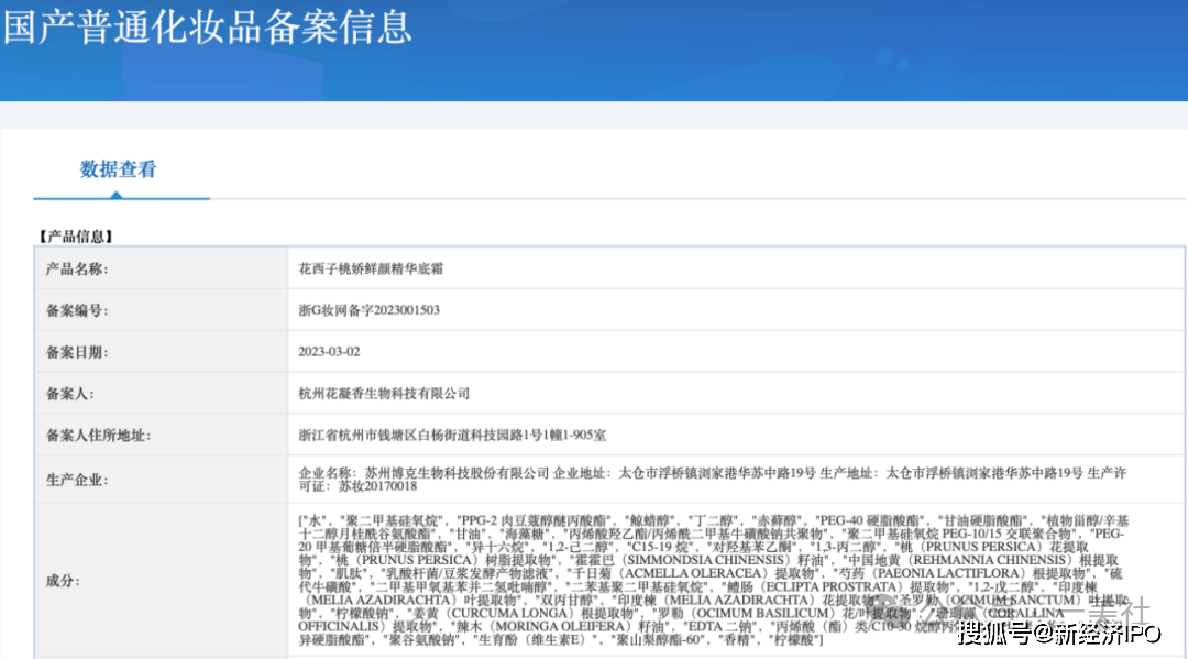 国家药监局官网的国产普通化妆品备案信息显示,花西子桃娇鲜颜精华底霜的成分表中包含鳢肠(ECLIPTA PROSTRATA)提取物、印度棟(MELIA AZADIRACHTA)花提取物和辣木(MORINGA OLEIFERA)籽油,与老爸评测提到的“鳢肠(ECLIPTA PROSTRATA)提取物、印度楝(MELIA AZADIRACHTA)叶提取物和辣木(MORINGA OLEIFERA)籽油的红色复合原料组”存在成分重合。