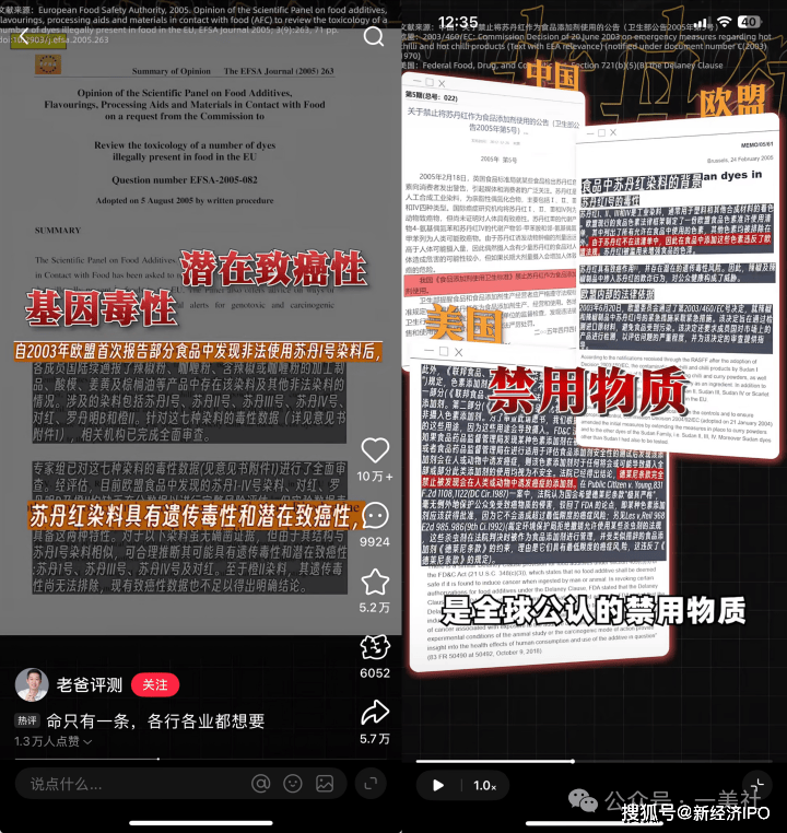 “老爸评测”在视频中也提及苏丹红Ⅳ具有基因毒性和潜在致癌性。