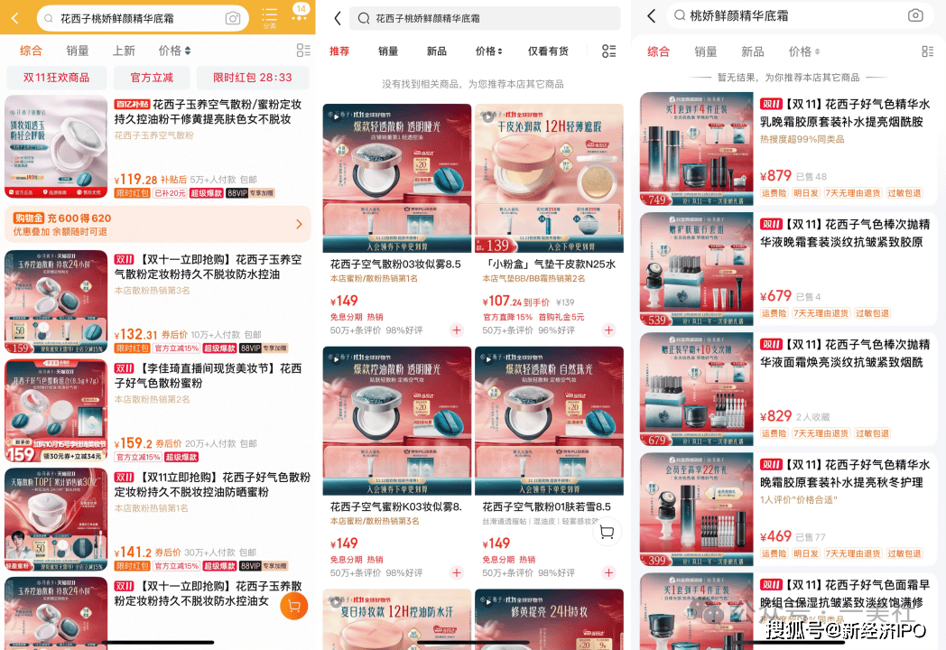 一美社发现,截至10月24日,花西子桃娇鲜颜精华底霜已从各大电商平台下架。在天猫旗舰店、京东自营旗舰店和抖音旗舰店等官方渠道均已搜索不到该产品。