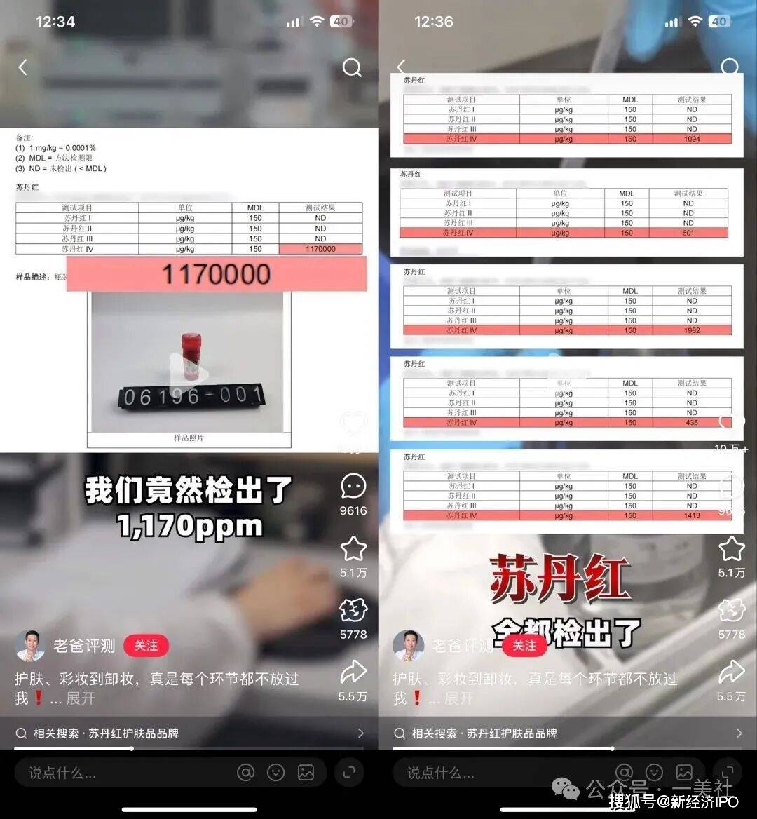 为验证猜想,测评团队对该原料单独送检,结果显示其中苏丹红Ⅳ含量高达1170ppm。随后,团队对采用同款原料的化妆品进行公证买样检测,所有样品均检出苏丹红Ⅳ。目前,“老爸评测”已将有关信息反馈至国家药品监督管理局。