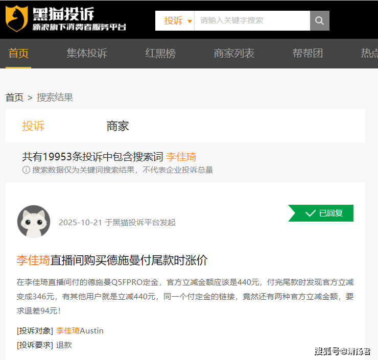 在黑猫投诉平台上,以“李佳琦”为关键词的投诉量高达19953条,其中也包括关于今年“双十一”的价格争议问题。