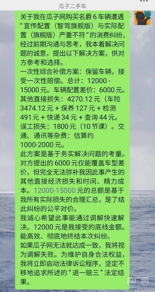10月17日,李先生对瓜子二手车平台提出保留车辆,并一次性综合补偿12000至15000元的解决方案,以覆盖配置差价、车险、检测费及误工成本。对此,平台答复,在保留车辆的情况下,最多只能按照新车指导价差补偿6000元。