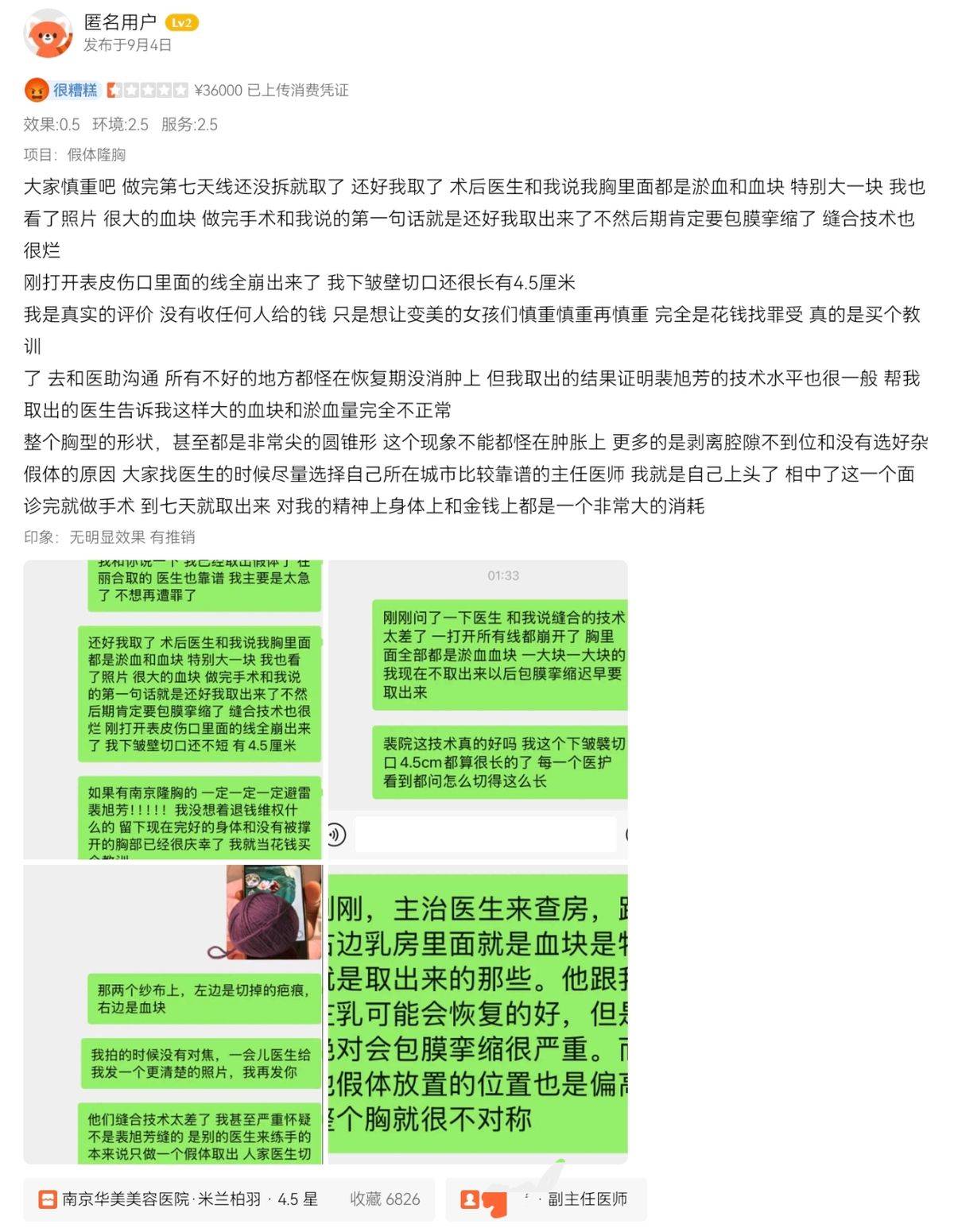 9月4日,另一位消费者也发布了差评,详细描述了其于该机构的消费过程。该消费者称,做完假体隆胸第七天,线还没拆除就进行了取出手术。术后医生告知其胸部内存在大量淤血和血块,有一块特别大,该消费者也查看了照片,看到很大的血块。医生术后第一句话是说:“还好已取出,不然后期肯定会出现包膜挛缩情况”。该消费者表示,医生缝合技术很差。刚打开表皮伤口时,里面的线全部崩开,其下皱襞切口长度达到4.5厘米。