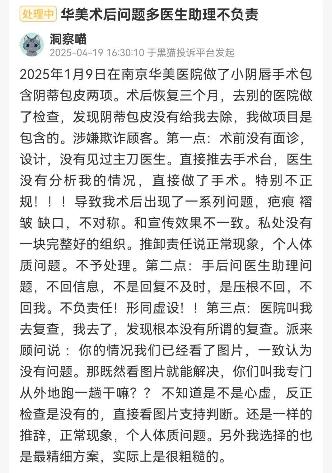 有消费者于4月19日在该平台对南京华美美容医院发起投诉。据消费者描述,1月9日,该消费者在南京华美医院做了小阴唇手术与阴蒂包皮两项手术。术后恢复三个月,该消费者去别的医院做检查,发现阴蒂包皮并未被去除,而其购买的项目明确包含阴蒂包皮去除,该消费者认为此举涉嫌欺诈顾客。