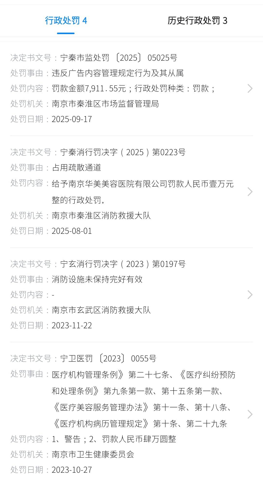 据信用中国显示,该机构自2023年起,两年时间就因违法发布医疗广告、使用非卫生技术人员从事医疗卫生技术工作、使用不具备美容皮肤科主诊医师资质的人员独立开展美容皮肤科医疗美容项目、未按规定保管病历资料等原因遭到有关部门四次行政处罚外,历史行政处罚还有三次。