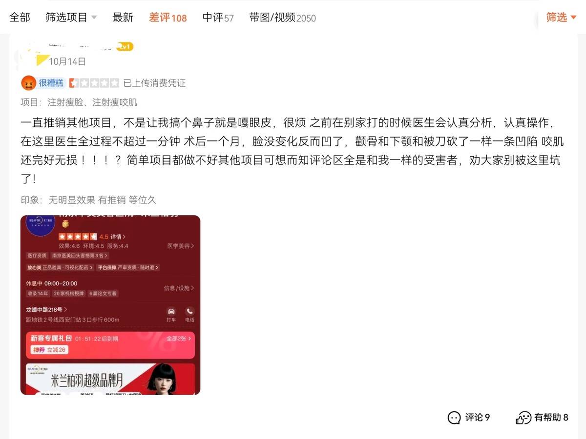 10月14日,有消费者发布评价,称该机构在服务期间一直推销其他项目,不是让其搞鼻子就是做割眼皮,令其很烦。此前,该消费者在别家做项目时医生会认真分析、操作。而在该机构做项目医生全过程不超过一分钟。该消费者表示,术后一个月,脸部没变化反而变凹,颧骨和下颚像被刀砍了一样有一道凹陷。