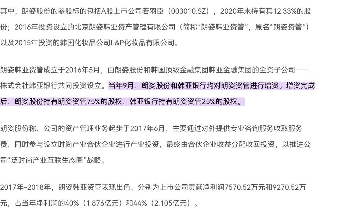 据21经济网报道的文章显示:朗姿韩亚资管成立于2016年5月,由朗姿股份和韩国顶级金融集团韩亚金融集团的全资子公司﹣株式会社韩亚银行共同投资设立。当年9月,朗姿股份和韩亚银行均对朗姿资管进行增资。增资完成后,朗姿股份持有朗姿资管75%的股权,韩亚银行持有朗姿资管25%的股权。