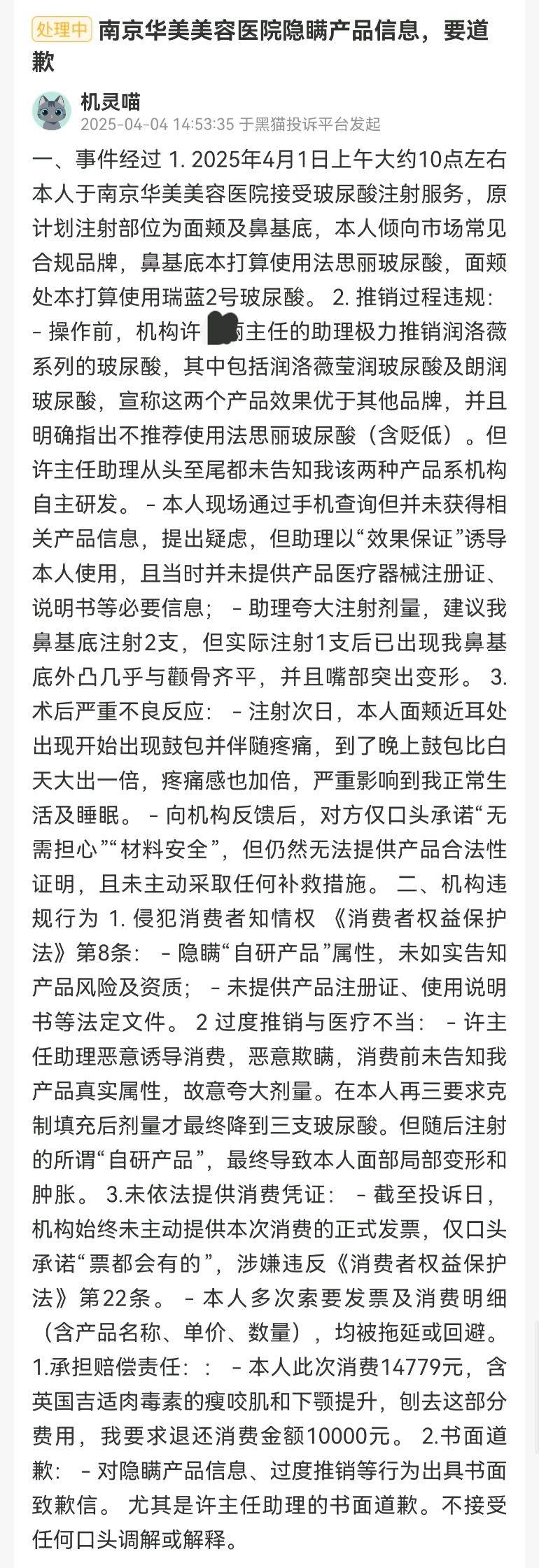 该消费者认为,许主任助理恶意诱导消费,恶意欺瞒,为其注射的所谓“自研产品”,最终导致该消费者面部局部变形和肿胀。而截至投诉日,该机构始终未主动提供本次消费的正式发票,仅口头承诺“票都会有的”,涉嫌违反《消费者权益保护法》第22条,该消费者多次索要发票及消费明细,均被拖延或回避。