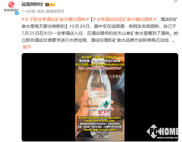 据多家媒体报道,近日有消费者反映,自己入住长沙的全季酒店,饮用酒店提供的农夫山泉矿泉水时发觉口味异常。经过水质检测发现,渉事全季酒店提供的农夫山泉矿泉水确有异味。全季酒店所属华住集团负责人与矿泉水品牌方也均承认确实有异味,但不知道什么原因。