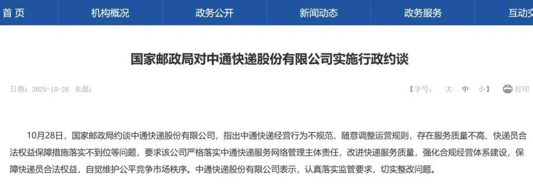 “10月28日,国家邮政局约谈中通快递股份有限公司,指出中通快递经营行为不规范,随意调整运营规则,存在服务质量不高、快递员合法权益保障措施落实不到位等问题,要求该公司严格落实中通快递服务网络管理主体责任,改进快递服务质量,强化合规经营体系建设,保障快递员合法权益,自觉维护公平竞争市场秩序。中通快递股份有限公司表示,认真落实监管要求,切实整改问题。”
