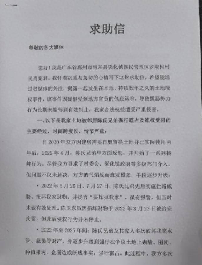 对此肖宪君表示,有关部门这一系列的反常操作,不得不让人质疑其中是否存在猫腻和充当黑恶势力保护伞。“面对长达数年的土地侵权和不公待遇,让我和我的一家人都身心俱疲。现在希望相关部门能依法公正处理土地纠纷,立即停止陈某东及其兄弟的侵权行为,拆除违法建筑和设施,恢复土地原状,并追究相关人员的法律责任,维护法律的尊严与社会的公平正义。”