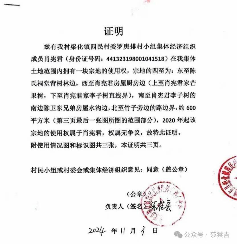 肖宪君陈述道:“在没有调查和处理结果下,2023年村里下发只针对我一方限制土地使用的通知书,而对同村陈某东多次蓄意挑衅、违法破坏财物的事一字不提。2024年镇里有关部门还强行拆除了我为保护财物安装的监控设备,并将我家不在争议范围内的土地强行围蔽。”根据肖宪君提供了一份村经济合作社在2024年出具的《证明》,其中清楚注明被有关部门强行围蔽的土地并不在肖陈土地纠纷范围内。