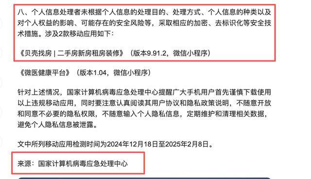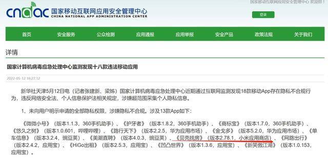 作为房地产服务行业的头部企业,始终伴随着贝壳找房的是争议不断的隐私泄露问题。早在2022年5月,国家计算机病毒应急处理中心就公布了18款存在隐私不合规行为的移动App,其中贝壳找房APP因“未向用户明示申请的全部隐私权限,涉嫌隐私不合规”被点名。2025年2月,《贝壳找房|二手房新房租房装修》(版本9.91.2,微信小程序)再次被国家计算机病毒应急处理中心点名,涉嫌“因个人信息处理者未能根据个人信息的处理目的、处理方式、信息种类以及对个人权益的影响、可能存在的安全风险等,采取相应的加密、去标识化等安全技术措施。”