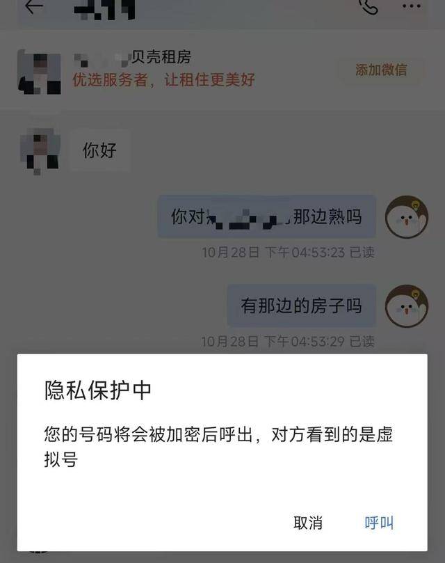 周先生称,他在贝壳找房APP曾向多位中介咨询杭州某小区的情况,但均未透露自己私人电话。“前两天通过平台提供的虚拟号码,我给其中一位中介打电话咨询,聊了大概十分钟,中间没有透露过我的真实号码,在整个咨询中,我也没有任何授权。”周先生说。在拨打隐私电话前,贝壳找房APP的弹窗清楚地显示“您的号码将会被加密后呼出,对方看到的是虚拟号。”