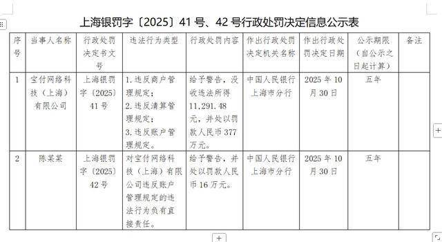 根据10月31日,中国人民银行上海分行公布一则行政处罚信息,宝付网络科技(上海)有限公司(以下简称“宝付支付”)因违反商户管理、清算管理、账户管理等3项规定,被给予警告,没收违法所得1.13万元,并处罚款377万元。
