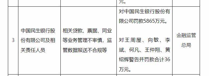 近日,金融监管总局对中国民生银行股份有限公司祭出一记重拳,开出高达5865万元的罚单,同时对王周屋等6名责任人予以警告处分,并合计处以36万元罚款。此监管举措如同一把利刃,精准指向该行在贷款、票据、同业业务管理方面的失察之责,以及数据报送的违规问题,深刻暴露出部分金融机构在高速发展进程中存在的合规短板。