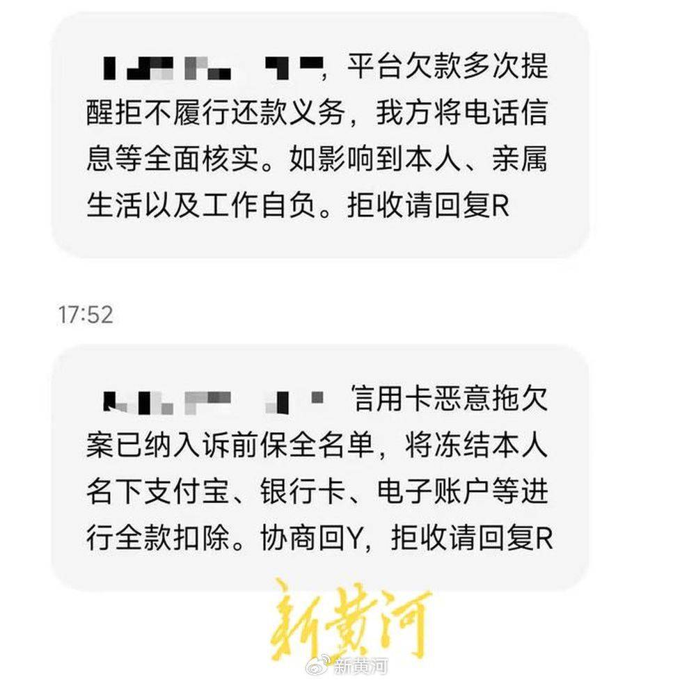 牛先生表示,半年前他因小生意资金流转需求,通过爱奇艺App上的小芽贷平台借款2万元,此前一直按分期要求正常还款,目前已偿还1万余元。今年10月,他因疏忽错过还款日一天,当天便与妻子一同收到催收短信。从牛先生提供的短信内容来看,其中明确提到“信用卡恶意拖欠案已纳入诉前保全名单,将冻结本人名下支付宝、银行卡、电子账户等进行全款扣除”“平台欠款多次提醒拒不履行还款义务,我方将电话信息等全面核实,如影响到本人、亲属生活以及工作自负”等表述。