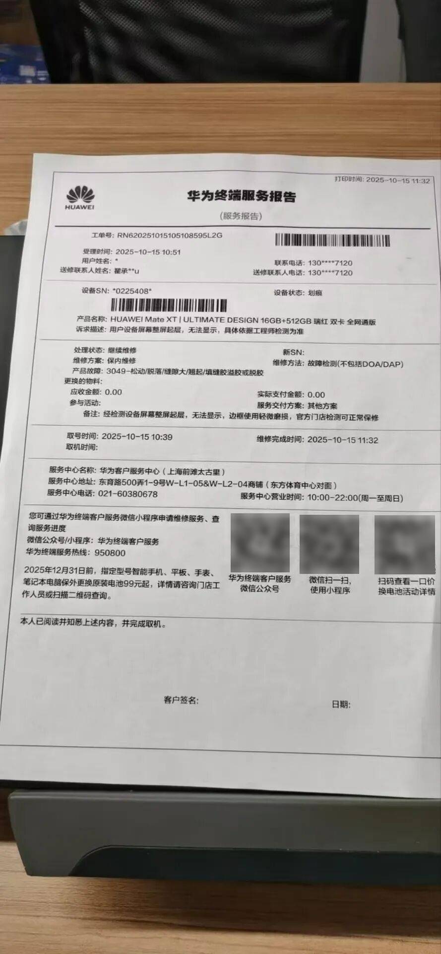 据瞿先生提供的上海华为客户服务中心的鉴定报告书显示,他的三折叠手机故障为3049-松动/脱落/缝隙大/翘起/填缝胶溢胶或脱胶,经检测设备屏幕整屏起层,无法显示,边框使用轻微磨损,官方门店检测可正常保修。