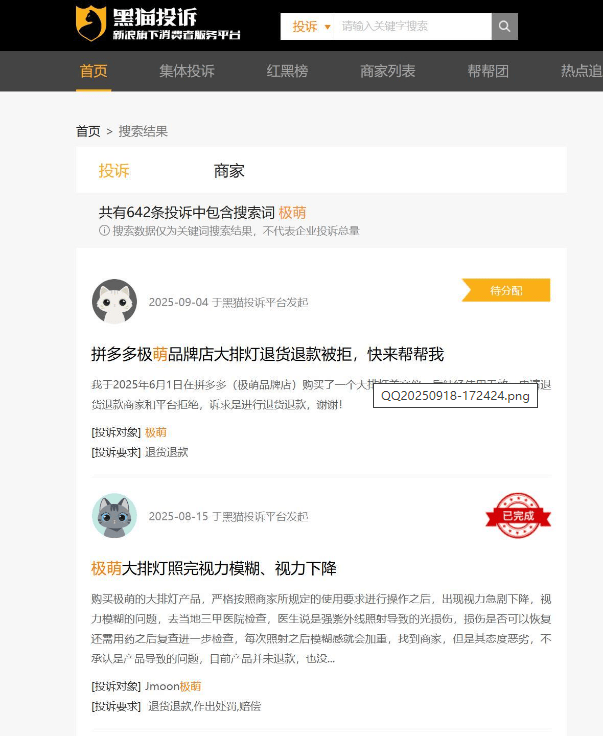 18日,极目新闻记者在黑猫投诉平台以“极萌”为关键词搜索,共有642条投诉中包含搜索词极萌,投诉内容包括视力下降、故障频发等。