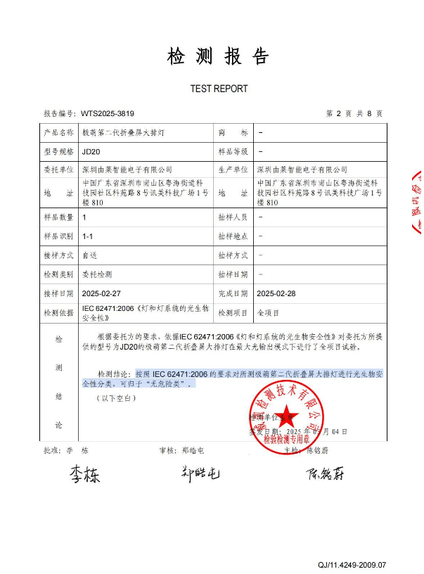 9月16日,极目新闻记者就王女士遭遇及相关消费者反馈致电极萌品牌方。品牌方回应称,产品是有测试过安全项以及护目镜的光波报告的。对于该消费者提供的病历,无法判定是因为使用了该司产品直接导致的。随后品牌方向记者出示了极萌第二代折叠屏大排灯的检测报告,检测结论为:按照 IEC 62471:2006 的要求对所测极萌第二代折叠屏大排灯进行光生物安全性分类,可归于“无危险类”。