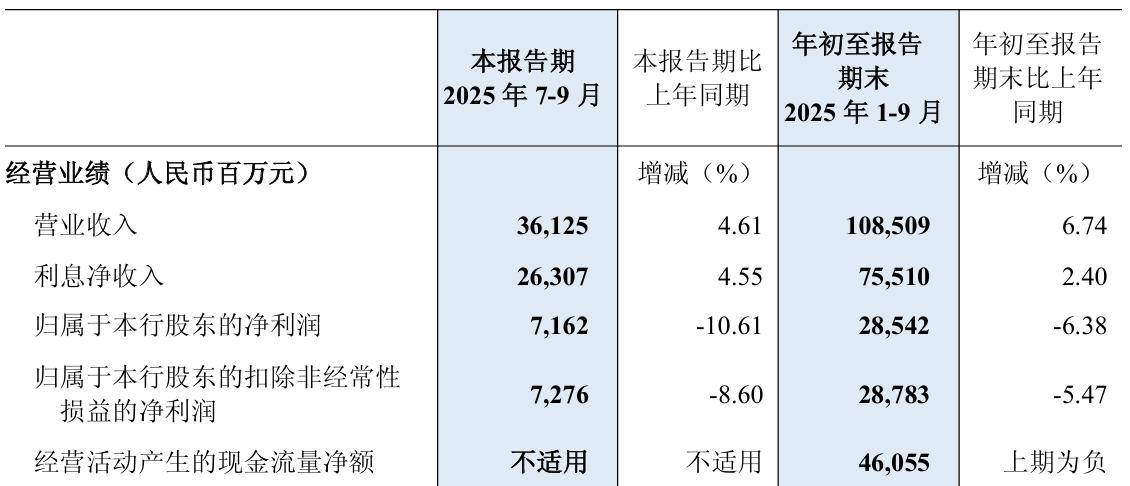 进入2025年后,民生银行的业绩仍未出现奇迹,前三季度该行实现收入1085.09亿元,同比增长6.74%;但归母净利润依旧同比下滑6.38%至285.42亿元,其中三季度归母净利润同比下滑10.61%,连续第七个季度下降。