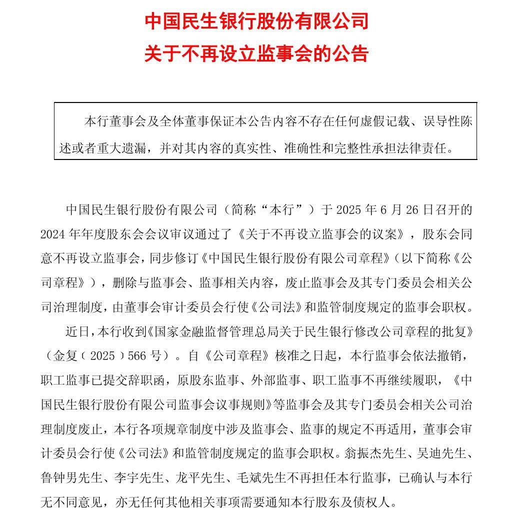 值得注意的是,不久前民生银行发布公告称,该行于近日收到国家金融监督管理总局关于其修改公司章程的批复,自核准之日起其监事会依法撤销,职工监事已提交辞职函,未来原由监事会行使的法定职权将转由董事会审计委员会承担。