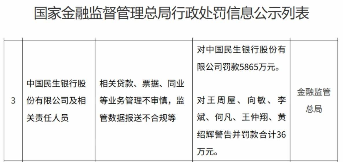 10月31日,国家金融监管总局发布的罚单显示,民生银行因相关贷款、票据、同业等业务管理不审慎,监管数据报送不合规等,被处以5865万元罚款。同时,王周屋、向敏、李斌、何凡、王仲翔、黄绍辉被警告并罚款合计36万元。